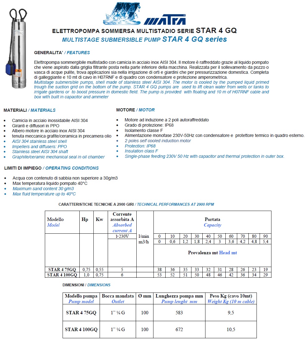 Nome:  ELETTROPOMPA SOMMERSA MULTISTADIO MATRA STAR 4 75GQ 4´´ HP 0,75 MT. 5-15-25-37-47 LT/MIN 50-40-30-20-5