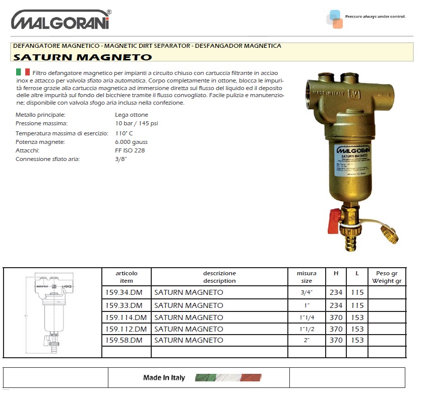 Nome:  DEFANGATORE MAGNETICO PER IMPIANTI TERMICI IN OTTONE 1´´ MALGORANI SATURN MAGNETO 159..33.DM