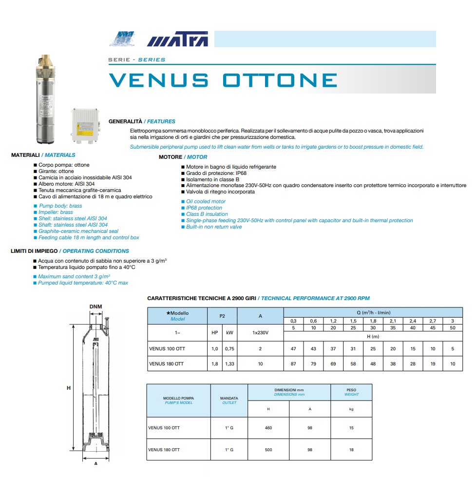 Nome:  ELETTROPOMPA SOMMERSA PERIFERICA MATRA VENUS 100 OTT 4´´ HP 1 MT. 5-15-25-37-47 LT/MIN 50-40-30-20-5
